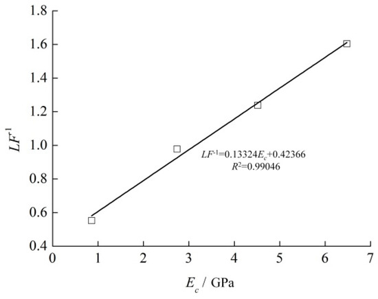 To obtain the LF, tests have been conducted on four cement mortar samples with elastic modulus varying from 0.86 GPa to 6.48 GPa. The test results show that the value of LF decreases as the elastic modulus increases. Figure 12 shows the test results, and it can be found that the value of LF decreases as the elastic modulus increases. Figure 13 shows the linear fitting relationship between LF and the elastic modulus of the cement mortar. According to the elastic modulus listed in Table 2, the values of LF in PDS No. 1 and No. 11 coal mines are 0.591 and 0.777, respectively.