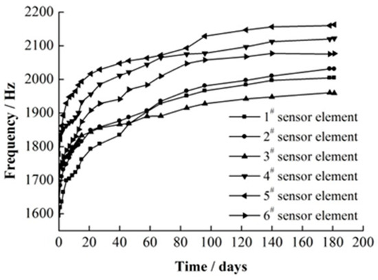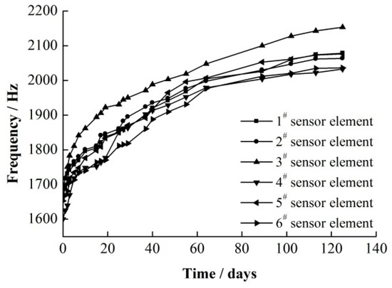 The information of transducers embedded in the PDS No. 1 coal mine is presented in Table 3., where the Azimuthal angle and dip angle are based on geodetic coordinates (x axis: north, y axis: west, z axis: vertical). Figure 14 shows the frequency evolution process of the six sensor elements with time during the measurement in PDS No. 1 coal mine. As shown in Figure 14, the testing time lasted 181 days.
