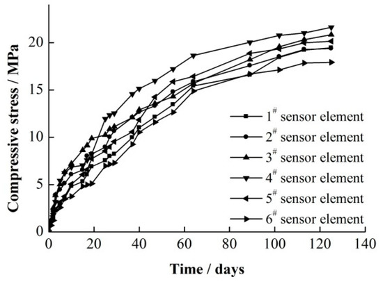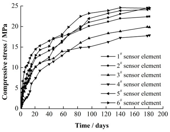 According to Equation (4), the variation in the compressive stress output from the transducer with test time can be obtained (see Figure 15). From Figure 15, it can be observed that the measured stresses increase rapidly during the first few days and gradually become stable when the time of the test exceeded 140 days. The characteristics of stress curves show are similar to classic creep curves for rock masses where the transient creep stage and steady-state creep stage are contained. It was also found that the time for the stress become stable was much longer than the relaxation time obtained from the creep test, which generally is in hundreds of hours. This indicated that the rheological process of the rock mass is much slower than that of the rock specimens.