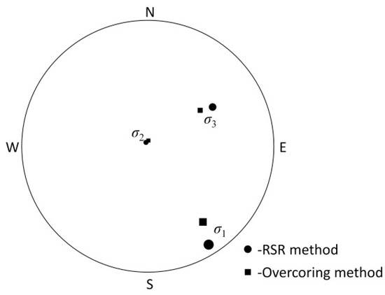 Furthermore, in situ stress measurement using the overcoring technique was carried out close to the location of the RSR method test conducted and a comparison of the principal stresses from different methods is presented in Figure 16. From Figure 16, it can be observed that the principal stresses obtaining from the overcoring method were smaller than those obtained by the RSR method, while the directions are similar to each other.