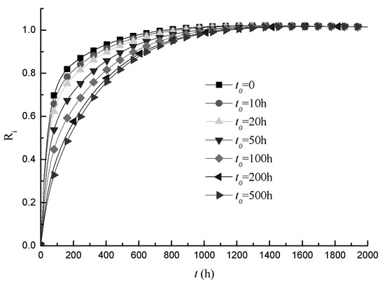 The second factor is the time interval after borehole is drilled before the injected cement mortar solidified. Beside the time interval of installment, the setting time of grout also has an effect on the stress measurement. To discuss the relationship between grout setting time and rate of stress recovery, seven different grout setting time t0, including 0 h, 10 h, 20 h, 50 h, 100 h, 200 h, and 500 h, were set. As shown in Figure 20, for different grout setting time t0, the rates of stress recovery increases with the time and finally near to 1.0, which means that recovered stresses (or measured stresses) can nearly reach to the initial stress. Therefore, for the Burgers viscoelastic model, the recovery stress can reach to 100% of the applied regardless of grout setting time. These results indicate that the time interval for grout setting time have effect on measuring time, but little on the measured in situ stress.