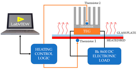 As a second step of this work, a Peltier cell 2 × 2 × 0.5 cm model TEC1-3103 [39] was analyzed with the aim of determining a method to identify a SPICE model from the acquired data. A specific test platform was therefore created (Figure 1a), which has the role of providing a stable temperature difference between the two sides of the Peltier cell. The system consists mainly of a 22 × 22 cm printed circuit board on a 2 mm thick thermal-controlled aluminum support, a 5 mm glass plate, an aluminum heat sink to be placed on the cold side of the TEG cell, a model S01138812M fan that has the role of cooling at room temperature the heatsink, and a control system managed by a Microchip ATMEGA2560 microcontroller, which communicates via USB–Serial bus with a host PC, where it is possible to control all the parameters of the platform and visualize as well as acquire measurement information by means of a LabVIEW-based HMI (Human-Machine Interface). The Peltier cell is fixed on the glass plate through a 150 µm double-sided thermal conductor, with thermal conductivity of 1.5 W (m · K) −1, also used for fixing and thermally interfacing the cold side of the cell with the aluminum heat sink. In order to prevent the heat, coming from the surface of the aluminum plate surrounding the cell, from affecting the temperature of the heat sink and therefore of the TEG cold side, the remaining glass surface was covered with an adhesive thermal insulator having a thermal conductivity of 0.0375 W (m · K)−1. Finally, a 100 kΩ negative temperature coefficient (NTC) thermistor is positioned immediately below the aluminum plate for monitoring and controlling the heater using a PID algorithm implemented on the microcontroller firmware, while a second thermistor of the same type is used to measure the temperature of the heat sink, in order to know and check the temperature difference between the two sides of the cell. The output of the cell is then connected to the programmable DC electronic load BK8600 by B&K Precision, which is controlled by the LabVIEW software and emulates the equivalent output resistive load, performing a resistive sweep and providing instantaneous output voltage and current of the cell under test. The final implementation of the system is illustrated in Figure 2.