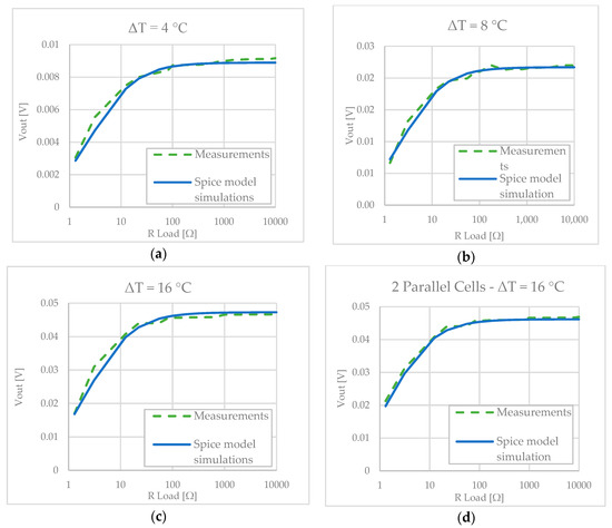 Once the SPICE model has been obtained by means of the above-described method, parametric load sweep simulations can be conducted and data can be compared with measurements, in order to validate the model at different temperature differences. The same procedure can be replicated with two or more TEG cells with different interconnection configurations, in order to verify the model validity even for multicell applications.