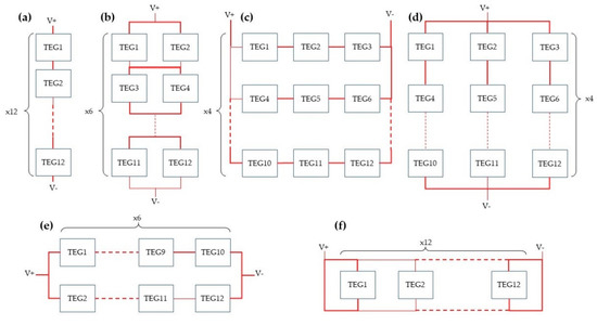 For the DC/DC design, a multicell configuration with 12 Peltier modules has been considered. First, it is necessary to analyze the equivalent SPICE circuit in order to identify the best connection strategy. Among all the possible configurations, six architectures have been considered, as depicted in Figure 8.