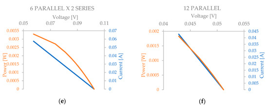 Figure 9. Multicell current–voltage (blue trace) and power–voltage (orange trace) simulation analysis with ΔT = 16 °C. (a) series of 12 cells, (b) 6 series of 2 parallel cells, (c) 4 parallels of 3 series cells, (d) 3 parallels of 4 series cells, (e) 2 parallels of 6 series cells, and (f) 12 parallel cells.