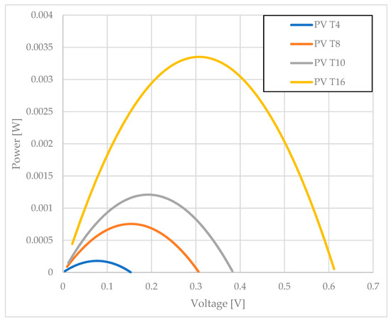 For each configuration, a load sweep analysis has been performed, in order to obtain the current–voltage (I–V) characteristic trace, as well as the power–voltage (P–V) characteristic curve for a temperature difference of 16 °C (Figure 9).