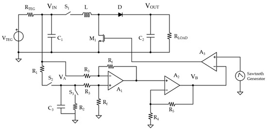 As mentioned in the previous paragraph, the fractional open-circuit voltage sensing is performed by closing switches S2 and S3 and opening the switch S1, in order to store the maximum power point voltage level by means of the capacitor C3. Here, an additional 100 nF capacitor C1 has been added at the output of the TEG source, in order to retain the output voltage during the switching transients. For the capacitor C3, a value of 1 μF has been chosen, while a resistive value of 10 kΩ has been selected for both resistors R1 and R2. The difference between the FOCV value and the instantaneous output voltage of the source is computed by means of the ideal op-amp A1 in differential amplifier configuration. All the resistors R3 and Rf have the same value of 200 kΩ. The PID algorithm introduced in the scheme of Figure 5 is here simplified to only a proportional contribution, represented by the non-inverting amplifier A2, where the gain has been set to 3, by means of the resistors R4 and R5.