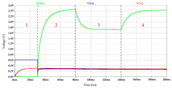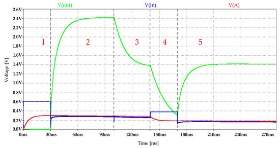 Figure 12. DC/DC converter VOUT (green trace), VIN (blue trace), and VA (red trace) simulation with load step variation. Region 1: input voltage sensing; Region 2: output voltage regulation; Region 3: load changing from 2 kΩ to 1 kΩ and output lowering for MPPT; Region 4: load changing from 1 kΩ to 2 kΩ and output boosting for MPPT.