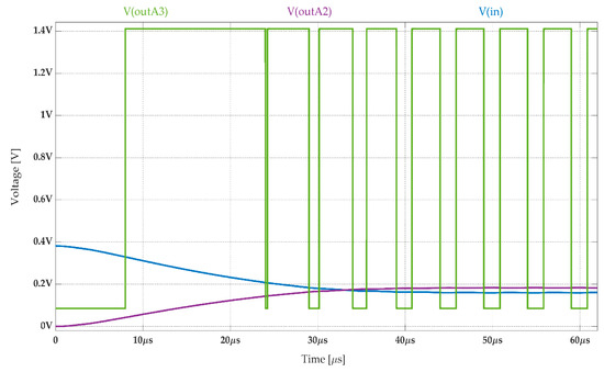 Finally, Figure 14 shows a time window reporting a transition between MPPT input voltage sensing and output voltage regulation modes regarding a load variation simulation. Once the FOCV has been updated, the signal produced by Op-Amp A2, which is the result of MPPT hardware processing, begins to rise and therefore, the PWM switching signal controlling the transistor M1 gradually modifies the duty cycle in order to perform the MPPT regulation of the output.