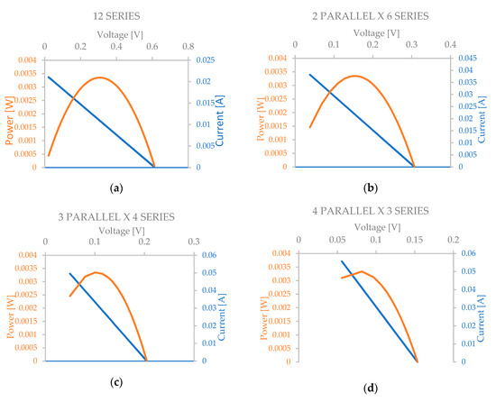 For each configuration, a load sweep analysis has been performed, in order to obtain the current–voltage (I–V) characteristic trace, as well as the power–voltage (P–V) characteristic curve for a temperature difference of 16 °C (Figure 9).