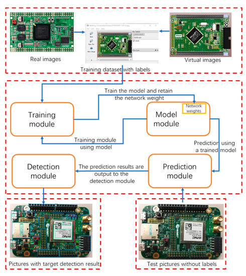 Vision-based inspection of electronic components on PCB can solve the problem of defect detection in 3C manufacturing. However, due to the wide variety and variety of electronic components, it has always been an industry problem. Zhou et al. found typical PCB electronic components, including protective coatings, markings and solder joints, proposed the detection of solder joints based on specular properties and the determined the specular interval of gray levels by the multilevel thresholding algorithm while passing the solder joint color. The distribution features are compared with the color distribution features of the reference object to identify and remove marks, via and other ineffective specular reflection regions, ultimately enabling automatic detection of multiple electronic components in the PCB image [10]. The electronic components detected by Chigateri et al. were transistors, capacitors and diodes. Therefore, a knowledge-based method is proposed for target detection, that is, first it determines the aspect ratio and the pin number of the component, then it calculates the roundness of the device, and finally achieves the detection target of the electronic component through correlation matching [11]. Li et al. used a novel background removal algorithm and by appropriately combining complementary information sources (e.g., diverse color spaces, scales, etc.), significantly improved localization performance in electronic components on PCB [12]. With the development of artificial intelligence technology, the use of deep learning to target detection of PCB electronic components can achieve the goal of robotic assembly in 3C manufacturing and production, and it has increasingly attracted the attention of researchers. Tang et al. has established a PCB defect dataset and proposed a novel group pyramid pooling module to extract features of a large range of resolutions, which were merged by group to predict PCB defect of corresponding scales [13]. Huang et al. produced and publicized a synthesized PCB dataset that has 1386 images with six types of common defects. Instead of simply superimposing the convolution layer, the authors used a dense shortcut from Densenet to achieve satisfactory defect detection with only a relatively small number of layers [14]. Kuo et al. were one of the first teams to try to detect common components on PCBs based on deep learning models, and they proposed a data set for common component inspection on PCBs and designed a novel Graph Network block to refine the component features conditioned on each PCB. Using the model SPN-T-W-GN-LF (Similarity prediction network with triplet loss and graph network), the mAP of electronic component detection on the testing of PCBs can reach 65.3% [15]. The previous two studies focused on the detection of a few types of electronic components in a simple scenario, although [15] used the embedded graph neural network to enhance feature implementation with the aim of detecting multi-target electronic components in a complex background, but since it is a three-stage pipeline, the problem of low efficiency and low robustness exists. We used the improved YOLO (you only look once) V3 [16] algorithm after the network structure changed based on the fast detection speed of a regression method to find electronic components. The detection accuracy significantly improved using virtual images for data enhancement and feature fusion based on different categories of training samples’ scale. Figure 1 shows the technical flowchart of this study [17].