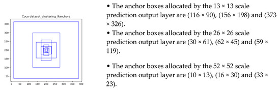 The concept of an anchor box is introduced in Faster RCNN, and k-means is used in YOLO V3 to find the anchor box size ratio to detect the target. Instead of directly mapping the coordinates of the bounding box, the parameters relative to the anchor box are predicted. There are nine anchor boxes of YOLO V3 based on the COCO (a large-scale object detection, segmentation, and captioning dataset) dataset; the nine clusters are: (10 × 13); (16 × 30); (33 × 23); (30 × 61); (62 × 45); (59 × 119); (116 × 90); (156 × 198) and (373 × 326). Different size feature maps correspond to different sizes of priori frames. Therefore, although YOLO V3 can use any reasonable set of anchor boxes for model convergence, the anchor box can be selected in a targeted manner by analyzing the training samples of the input training data set, and we can achieve more effective training convergence. The finer the grid cell can detect finer objects, and the larger the scale, the smaller the receptive field and the more sensitive it is to small objects. Therefore, YOLO V3 assigns the following nine anchors to the prediction output of three different scales. In YOLO V3, the size and distribution of COCO data set’s nine anchors are shown in Figure 3.