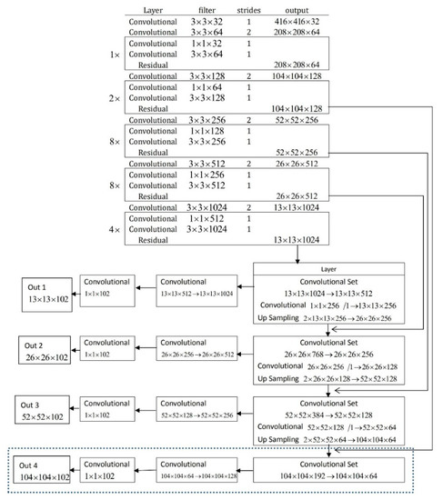 YOLO V3 consists of the backbone network called Darknet-53, the upsampling network, and the detection layers called YOLO layers [19]. The backbone network of YOLO V3 is based on Darknet-53 to extract feature images from the input image. The whole network mainly uses residuals as the basic components. A total of five residual layers with different scales and depths are selected, and they only perform residuals between outputs of different layers. Each residual block consists of a pair of 3 × 3 and 1 × 1 convolutional layers with quick connections, and the total number of convolutional layers is 53. The size of the final feature map has a spatial resolution 1/32 smaller than the input image. YOLO V3 uses a three-scale YOLO layer that is responsible for detecting objects of different scales. In the first YOLO layer, the grid resolution is 1/32 of the input image detecting large objects. The resolution of the last YOLO layer is 1/8, which is capable of detecting small objects. There are multiple convolution layers and one upsampling layer between the YOLO layers. Each layer has a convolution sublayer, a batch normalization sublayer and a leaked ReLU (Rectified linear unit) activation sublayer. Some quick connections connect the middle layer of Darknet-53 to the layer after the upsampling layer. The network structure for YOLO V3 is shown in Figure 2.
