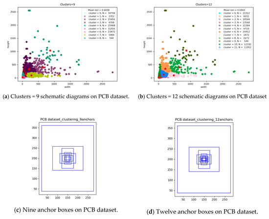 YOLO V3 uses the concept of anchor boxes when doing bounding box prediction. The meaning of an anchor box is the most likely the object width and height. This is obtained by clustering in advance; for example, when we want to use a pixel to predict an object. Around this pixel, we can predict the shape of an infinite number of objects. It is not a random prediction. It is necessary to find the size of the anchor box that is the most likely to be counted from the labeled data. In Section 2, we showed the schematic diagram of the nine anchor box sizes generated by the original YOLO V3 based on the COCO data set. In order to adapt to the detection target of PCB electronic components, we use the k-means++ algorithm to generate nine and 12 anchor boxes according to the three output ports of original YOLO V3 and the four output ports of the improved YOLO V3. We can get nine anchor boxes of YOLO V3 based on the PCB dataset through the calculation; the nine clusters are: (13 × 31); (21 × 42); (31 × 15); (34 × 58); (51 × 29); (57 × 98); (78 × 48); (150 × 118) and (255 × 323). There are 12 anchor boxes of improved YOLO V3 based on the PCB dataset; the 12 clusters are: (13 × 24); (14 × 34); (19 × 10); (24 × 14); (28 × 54); (33 × 15); (35 × 33); (47 × 23); (54 × 87); (69 × 45); (146 × 118) and (255 × 323). We assign these anchor boxes to the improved YOLO V3. The anchor boxes allocated by the 13 × 13 scale prediction output layers are (69 × 45), (146 × 118) and (255 × 323); the 26 × 26 scale prediction output layers are (35 × 33), (47 × 23) and (54 × 87); the 52 × 52 scale prediction output layers are (24 × 14), (28 × 54) and (33 × 15); and the 104 × 104 scale prediction output layers are (13 × 24), (14 × 34) and (19 × 10). Figure 7 shows nine cluster anchor boxes and 12 cluster anchor boxes generated based on the PCB dataset.