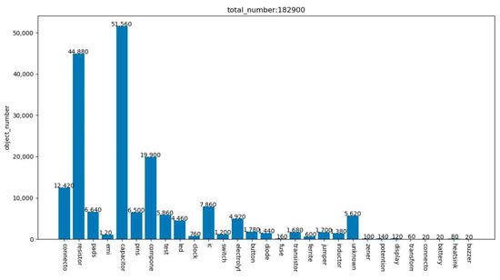 To solve the problem of dataset establishment, we used 47 photos of the physical photos published in [15] as data sets. Some of these PCB photos came from the Internet, while others came from an industrial camera. This data set is available in [15]. Before using the pcb_wacv_2019 data set, we did a statistical analysis of the label data of the data set. We found that the number of labels in the original data set was 17,829, the label names were 5285 and the number of text label was 9190. The label names were composed of the device name + silkscreen number, such as ‘capacitor C18’, ‘resistor R2’ and so on. The label information in this data set contains all the devices and text content on the PCB and therefore is very comprehensive, but for our detection task—the identification of electronic components—the silkscreen number and text are redundant information. Therefore, we have merged and deleted the label information. We merged the label data with the same device name and deleted the text label. The processed label name and number statistics are shown in Table 1.