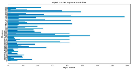 As we know, we usually use a bounding box to describe the target location in object detection. The bounding box is a rectangular box that can be determined by identifying the x and y coordinates of the upper left corner and the height and width of the box (bx, by, bh, bw). The input image is divided into an S × S (in this paper, S × S means 13 × 13, 26 × 26, 52 × 52 and 104 × 104) grid of cells. For each object that is present on the image, one grid cell is said to be “responsible” for predicting it. Each grid cell predicts three bounding boxes as well as 29 category probabilities. Electronic components on the PCB are closely distributed and numerous. To accurately identify the electronic components, we analyzed the number of electronic components on the PCB, as shown in Figure 9. Therefore, it was determined that the total number of predicted bounding boxes on each test image is not less than 800. Therefore, the original YOLO V3 bounding boxes with 120, and the improved 800, are tested respectively in the experiments.