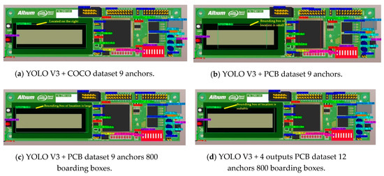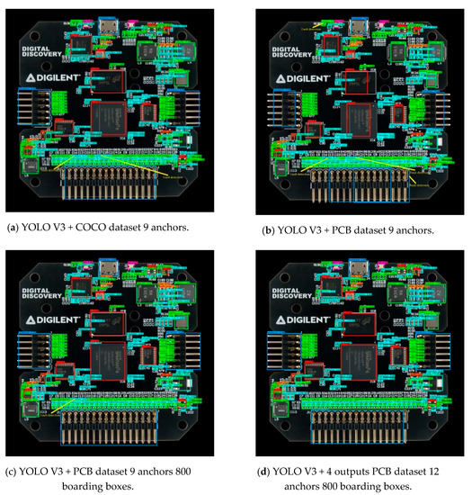 Figure 12 shows the effect of the four algorithms on detecting larger size targets. Now we are focusing on IC (integrated circuit) devices on the PCB. From Figure 12a, we can see that the three ICs on the left side have not been detected; this means the original YOLO V3 still has problems in detecting larger-sized devices. Figure 12b does not show significant changes. After increasing the number of bounding boxes in each picture, we can observe that some ICs have been detected in Figure 12c,d which shows that all ICs are displayed in bounding boxes accurately.