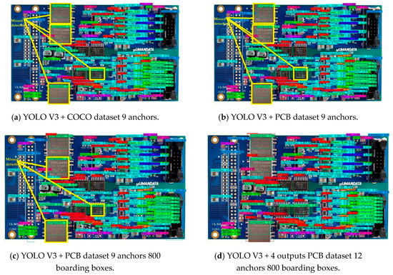 The above four algorithms can realize multi-object detection in one image and we tested 200 images with them. The detection object is matched in different bounding boxes and some detection results are expressed as follows (Figure 10, Figure 11 and Figure 12). The four subfigures a–d of Figure 10, Figure 11 and Figure 12 represent the detection effects of the above four algorithm experiments. For the sake of simplicity, we use algorithms in subfigures a–d of Figure 10, Figure 11 and Figure 12 to represent YOLO V3 + COCO dataset 9 anchors, YOLO V3 + PCB dataset 9 anchors, YOLO V3 + PCB dataset 9 anchors 800 boarding boxes, and YOLO V3 + 4 outputs PCB dataset 12 anchors 800 boarding boxes from Figure 10, Figure 11 and Figure 12. The algorithm in every subfigure d of Figure 10, Figure 11 and Figure 12 is our final improved YOLO V3 method for detecting PCB electronic components. Here we use yellow lines to mark the difference between the four algorithms.