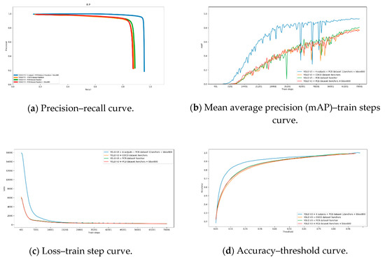 To comprehensively compare and analyze the advantages and disadvantages of the four algorithms, we have drawn four curves for comparative analysis in Figure 13. Among the four curves, we use orange to represent YOLO V3 + COCO dataset 9 anchors algorithm, green for YOLO V3 + PCB dataset 9 anchors algorithm, red for YOLO V3 + PCB dataset 9 anchors + bbox800 algorithm, and blue for YOLO V3 + 4 outputs + PCB Dataset 12 anchors + bbox800 algorithm.