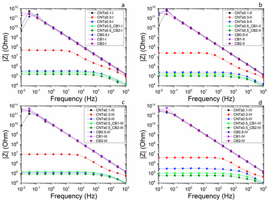 Concerning the duration of the dispersion process, among the binary groups, the CNTs0.1-I, the CB0.5-I, the CB1-I and the CB2-I exhibited a stable highly dielectric behavior regarding dispersion time (Figure 2). CNTs0.3-I presented a slight decrease of the impedance indicating the continuous de-agglomeration of the CNTs aggregates during the dispersion process. However, after 4 h of dispersion, the impedance of CNTs0.3-IV (Figure 2d) did not reach the impedance of the specimens with filler content above the percolation threshold. CNTs0.5-I also showed a minor drop of the impedance until the third hour of mixing, followed by an increase after the fourth hour of dispersion by almost half an order of magnitude (Figure 2d). This denoted the structural degradation of the MWCNTs due to extensive dispersion process.
