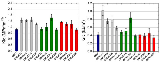In terms of Gic values, all systems with CNTs had the same behavior with the Kic values except for CNTs0.1-I, which presented an increase of 142% from the first hour of dispersion. This notable improvement can be attributed to the large scale of agglomerates, which can increase the energy required until the fracture of the specimens. However, for all the CNT modified specimens, the fourth hour of dispersion resulted in a degradation of the Gic values compared to the neat specimens.