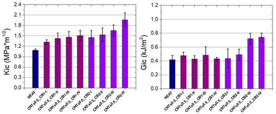 Figure 5 presents the mean values of Kic and Gic for the ternary systems. As can be observed, all the ternary systems exhibited a total increase of Kic when compared with the neat systems. The average Kic values increased by 40% after four hours of dispersion for the CNTs0.5_CB1 specimens, while a more pronounced enhancement of about 81% was exhibited by the CNTs0.5_CB2 specimens in comparison to the neat specimens. The combination of the two fillers, which possess nano and micro dimensions, respectively, created a synergetic effect which is capable of hindering crack propagation and producing crack bifurcation phenomena. Moreover, the average Gic values of the CNTs0.5_CB1 were not affected in comparison to the neat specimens. However, a significant improvement by about 65% was observed for the CNTs0.5_CB2-III and the CNTs0.5_CB2-IV systems when compared to the neat specimens.