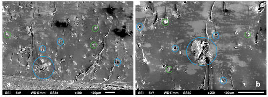 A different morphology was observed at the fracture surface of the binary CB2-II specimen, where more and bigger matrix cracks were observed in comparison to the CNTs0.5-III binary specimen. In this case, the crack pinning was the dominant failure mechanism (as indicated by the green circles in Figure 6a,b). Furthermore, particle pull-out and breakage along with void creation, were observed for the CNTs0.5-III binary specimen (as indicated by the blue circles in Figure 6a,b).