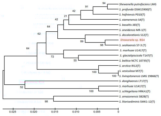 Phylogenetic tree showing the position of Shewanella sp. BS4 and its closest neighbors with a bootstrap value of 1000.