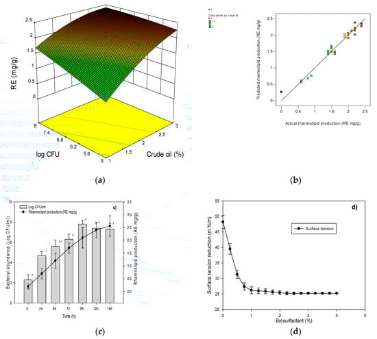 (a) Three-dimensional contour plot for maximum rhamnolipid production expressed as RE (rhamnose equivalents) mg g−1 cell dry weight as a function of inoculation load and crude oil (%), (b) Predicted vs. actual values for rhamnolipid production based on response surface methology (c) Growth and rhamnolipid production in RSM optimized media, (d) Graph of surface tension vs. concentration of the rhamnolipid. Different lower case letters after values indicate a significant difference at a p-value of 0.05 as determined by Duncan’s multiple range test.