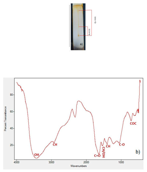 The thin-layer chromatographic slide proving mono- and di-rhamnolipid presence in the extracted mixture (a) and Fourier transform infrared spectroscopic (FT-IR) spectra confirming the presence of a rhamnolipid-type biosurfactant (b). Rf–retention factor (0.31 for di-rhamnolipid and 0.81 for mono-rhamnolipid).