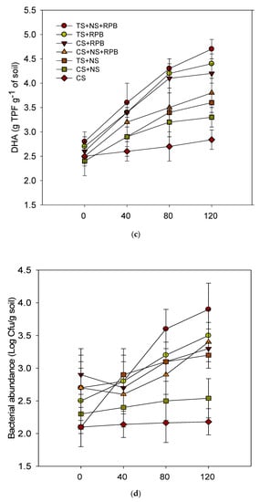 Phytotoxicity evaluation of treated soils based on germination studies revealed the highest germination (92%) in the TS + NS + RPB treatment, followed by the TSB + RPB treatment (Figure 4e). These treatments also supported better plant growth in these soils, which was evident by an 86.9% increase in germination percentage compared to contaminated soil (CS) (Figure S2). Soil respiration and DHA activity are the measures of total microbial activity in soil [,,], and any change in organic matter quantity or quality can be observed as a change in soil respiration [,] and/or in DHA activity []. The results of the present study clearly showed that the addition of rhamnolipids improved the activity of Shewanella sp. BS4 and the native soil microbial community, which in turn improved the hydrocarbon bioremediation process. Although the native soil microbes did not play a major role in the bioremediation process, the oil-polluted soil bioremediation was more efficient in the case of the simultaneous application of rhamnolipid and Shewanella sp. BS4.