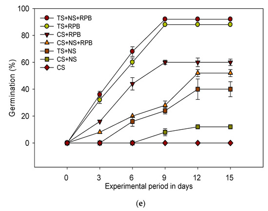 To test the toxic effect of differently treated soils on plants, a germination assay was carried out according to the methods of Marecik and Biegańska-Marecik []. Briefly, 40 g of soil from each treatment was placed into a Petri dish (150 mm) containing sterile soil with a 65% water holding capacity (adjusted with distilled water). Twenty red pepper seeds were gently pressed into the soil and incubated in covered Petri dishes at 25 °C under dark conditions for 72 h. The number of germinated seeds was recorded at periodic intervals of 0, 3, 6, 9, 12, 24 days, and the germination percentage was calculated.