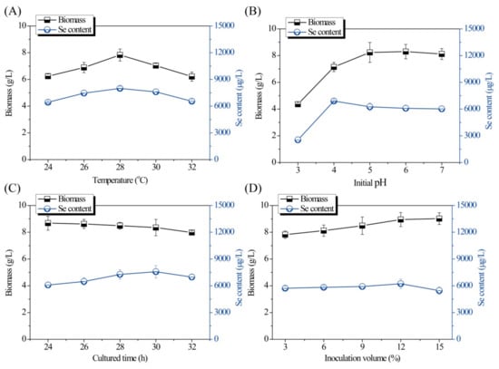 Effects of (A) temperature, (B) pH, (C) culture time, and (D) inoculation volume on Se content and biomass of Se-enriched discarded beer (DB)-yeast fermentation.