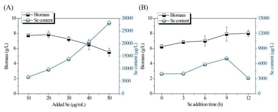 Effects of (A) Se concentration and (B) Se addition time on Se content and biomass of Se-enriched DB-yeast fermentation.