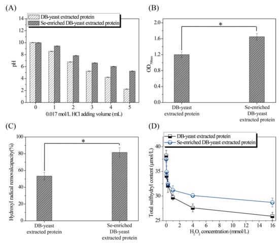Characterization of DB-yeast and Se-enriched DB-yeast extracted proteins. (A) pH of extracted proteins (20 mL) after mixing with 0.017 mol/L HCl (0 to 5 mL). (B) Reducing power of extracted proteins (10.0 mg/mL of extracted proteins). (C) Hydroxyl radical removal capacity of extracted proteins (0.4 mg/mL of extracted proteins). (D) Effect of different H2O2 concentrations on total sulfhydryl content (3.6 mg/L of extracted proteins). * Statistically significant (p-value <0.05).