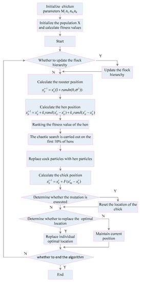 The CSO algorithm is a biologically inspired metaheuristic algorithm, which imitates swarm foraging [34,35]. The CSO algorithm includes roosters, hens, and chicks. The rooster is the leader of the flock and leads the population to find food; the hen follows the rooster for food; and the chick follows the hen for foraging. The algorithm follows the following four rules: