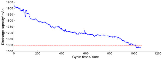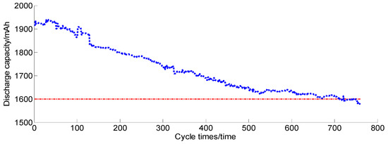 The lithium-ion battery capacity decay curve is shown in Figure 3. As the number of cycles increases, the battery discharge capacity gradually decreases. The dotted line in Figure 3 indicates the failure threshold. When the battery capacity is reduced to the failure threshold, the battery fails. The failure threshold is 80% of the rated capacity in this paper. The failure thresholds of NMC1 and NMC2 battery are 1600/mAh.