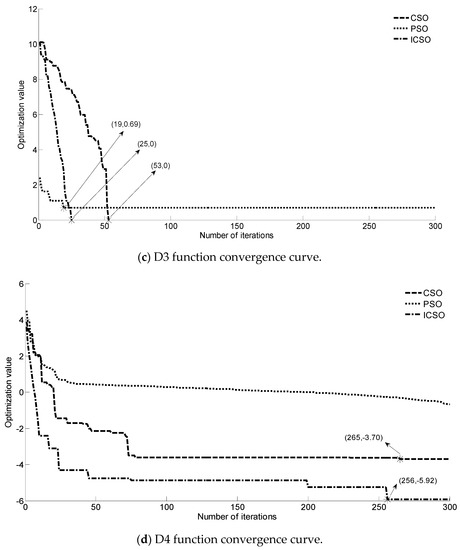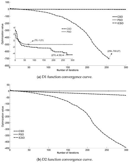 Table 1 shows the convergence accuracy and calculation cost of the three optimization algorithms. By analyzing the convergence results of the three algorithms, it is found that neither PSO nor CSO converge to 0 for the D1, D2 and D4 functions. Compared with CSO and ICSO, the convergence result of PSO is poor, which is caused by the fact that the ability of PSO to jump out of the minimum is poor. For D1 and D3, the ICSO converges to 0; for D2 and D4, the ICSO does not converge to 0, but the convergence value of the ICSO is significantly better than that of PSO and CSO.