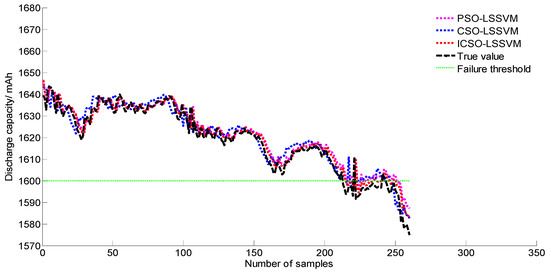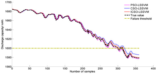 The first 700 sets of NMC2 battery capacity data are used as training samples. Then the 360 groups of data are predicted by PSO-LSSVM, CSO-LSSVM and ICSO-LSSVM models. The NMC2 battery life prediction curves for each model are shown in Figure 9.