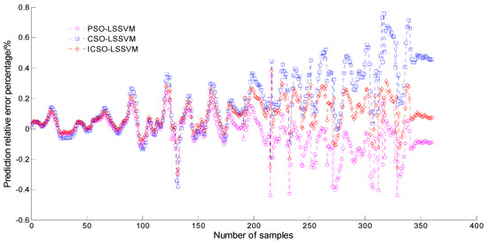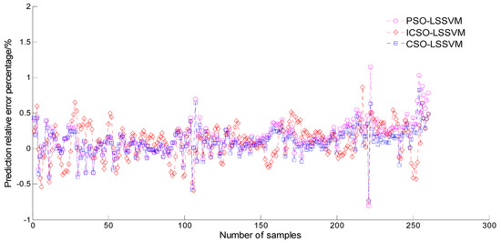 The prediction error of the model before 200 samples is small, and the RE interval is controlled at [−0.4% 0.4%]. After 200 test samples, the prediction error of CSO-LSSVM and PSO-LSSVM increases, and the maximum RE of PSO-LSSVM is close to 0.8%. Compared to the blue and pink line, the red line fluctuations are more stable as shown in Figure 10.