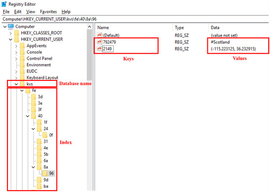 We create a new database for WR-Store under a certain root registry. Here, we can choose a root registry key according to the desired security level for the key-value store because any logged in users can access HKCU, but only administrators can access HKLM. Consequently, we make a database in one of the following paths: (1) “Computer\HKLM\DBName” or (2) “Computer\HKCU\DBName”. In Figure 2, the used root key is HKCU, and the database name is “”.