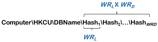 Figure 3 shows a registry path for a hash-based multi-level registry index in WR-Store. A registry path for indexing consists of hash values where each hash value i (1 ≤ i ≤ ) has a length and is used for an i-th level index in the Windows registry. We can define as the depth of the registry and as the length of each subkey in the registry path. Therefore, the total length of a registry path for indexing is × .