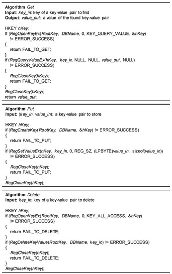 Stable operations: The Windows registry is always accessed from the Windows applications. Especially, the system processes such as explorer.exe and services.exe are always working even if the users do not execute any applications at all. They use the built-in APIs provided by Windows to access to the Windows registry, which has been shown in Table 1. WR-Store is also developed based on the same APIs. Figure 4 shows that all the algorithms for the basic operations of the key-value store (i.e., , , and ) are based on the built-in APIs. As a result, WR-Store becomes one of normal Windows applications that are working with the Windows registry.