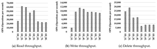 Figure 8 shows the processing time of , , and as the number of continuous operations k is varied from 1 to 1 million. We use as the data set. Even if the overall performance difference is less than the case where is varied, there exists meaningful performance difference as and are varied. For the read operations, is the most efficient. When k is 1 million, outperforms by 2.21 times and 1.81 times. For the write operations, is slightly more efficient than the other settings. When k is 1 million, outperforms by 1.64 times and 1.39 times. For the delete operations, is the most efficient. When k is 1 million, outperforms by 1.55 times and outperforms by 1.55 times.