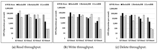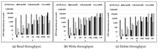 We measure three kinds of operations to evaluate the performance of the key-value stores: (1) read operations, (2) delete operations, and (3) write operations. To measure each set of operations, we conduct the basic operations in the key-value store continuously, i.e., () for the read operations, () for the delete operations, and () for the write operations. To check the change of the performance as the number of continuous operations k is increased, we vary k from 1 to 1 million for a data set. For a small (or large) k, initial cost of the key-value store occupies a large (or small) portion. We measure the processing time in microseconds (s) using a Windows API () and convert it into the operations per second (simply, ) for the presentation.