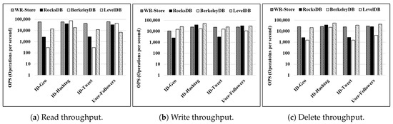 Throughput on various real data sets. (a) Read throughput; (b) Write throughput; (c) Delete throughput.