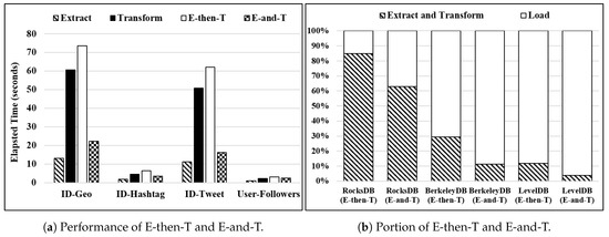 To show the performance of the proposed E-and-T method, we conduct some experiments. Figure 16 shows the performance analysis of two proposed ETL methods for WR-Store, i.e., E-then-T and E-and-T. Here, we use four real data sets and fix the number of continuous operations as 10 thousand. The elapsed time of the E-then-T method consists of two parts: (1) that of the extract process and (2) that of the transform process. We measure those parts separately to compare each one with the elapsed time of the E-and-T method. Figure 16a shows the elapsed time of extract, transform, E-then-T, and E-and-T. The result shows that E-and-T is much more efficient than E-then-T. Specifically, E-and-T outperforms E-then-T by 1.24 ∼ 3.85 times as the data set varies. We indicate that E-and-T needs a slightly more time than the export-only process while E-then-T requires much time for the transform process, which involves the pattern matching. We note that the performance improvement of E-and-T over E-then-T becomes larger for large-scaled data sets, i.e., ID-GEO and ID-Tweet. The performance improvement is 3.30 times and 3.85 times, respectively.