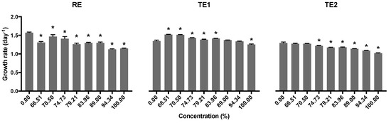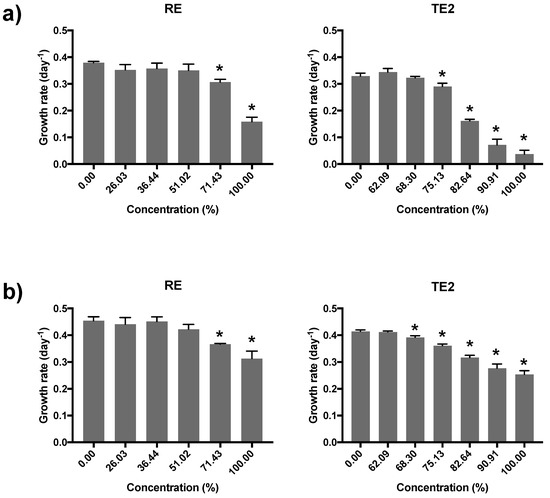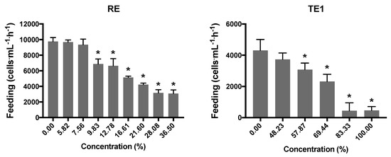 Average feeding rate (cells∙mL−1∙h−1) of D. magna after exposure to different concentrations of raw effluent (RE) or treated effluent 1 (TE1) compared to the control. Error bars represent the standard deviation of the mean (n = 4); asterisks indicate statistically significant differences from the control (Dunnett´s test p < 0.05).