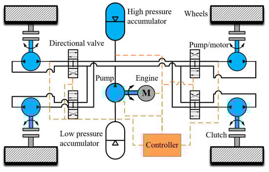 Schematic diagram of the hydraulic hybrid vehicle with a series connection.