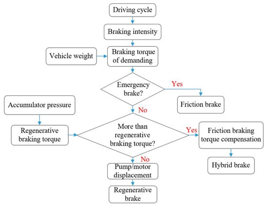 The energy control strategy directly affects the energy recovery rate, and it includes calculation of the required braking torque based on the driving condition, calculation of the hydraulic braking torque according to the pressure of the accumulator, the target torque for the pump/motor, and other modular. Flow chart of the critical control strategy is shown in Figure 3. Firstly, the braking mode is judged and decided through calculating the required braking torque according to the present driving conditions. If the braking mode is emergency brake, the friction brake is adopted to ensure safety. Otherwise, the target torque is compared with the regenerative braking torque. If the regenerative braking torque supplied by the hydraulic accumulator can meet the requirement, only the hydraulic brake is adopted. Otherwise, the friction brake will be used to compensate the lack of the braking torque. Thirdly, the recycled energy stored in the hydraulic accumulator can be released when the vehicle starts again or accelerates. Thus, due to incompressibility of the used hydraulic oil, possible failure of the regenerative braking system would not result in the crash potentials, and the friction brake could keep safety of the driving cycle. The double-brake system not only can improve the safety factor of the vehicle, but also will increase the energy usage efficiency.